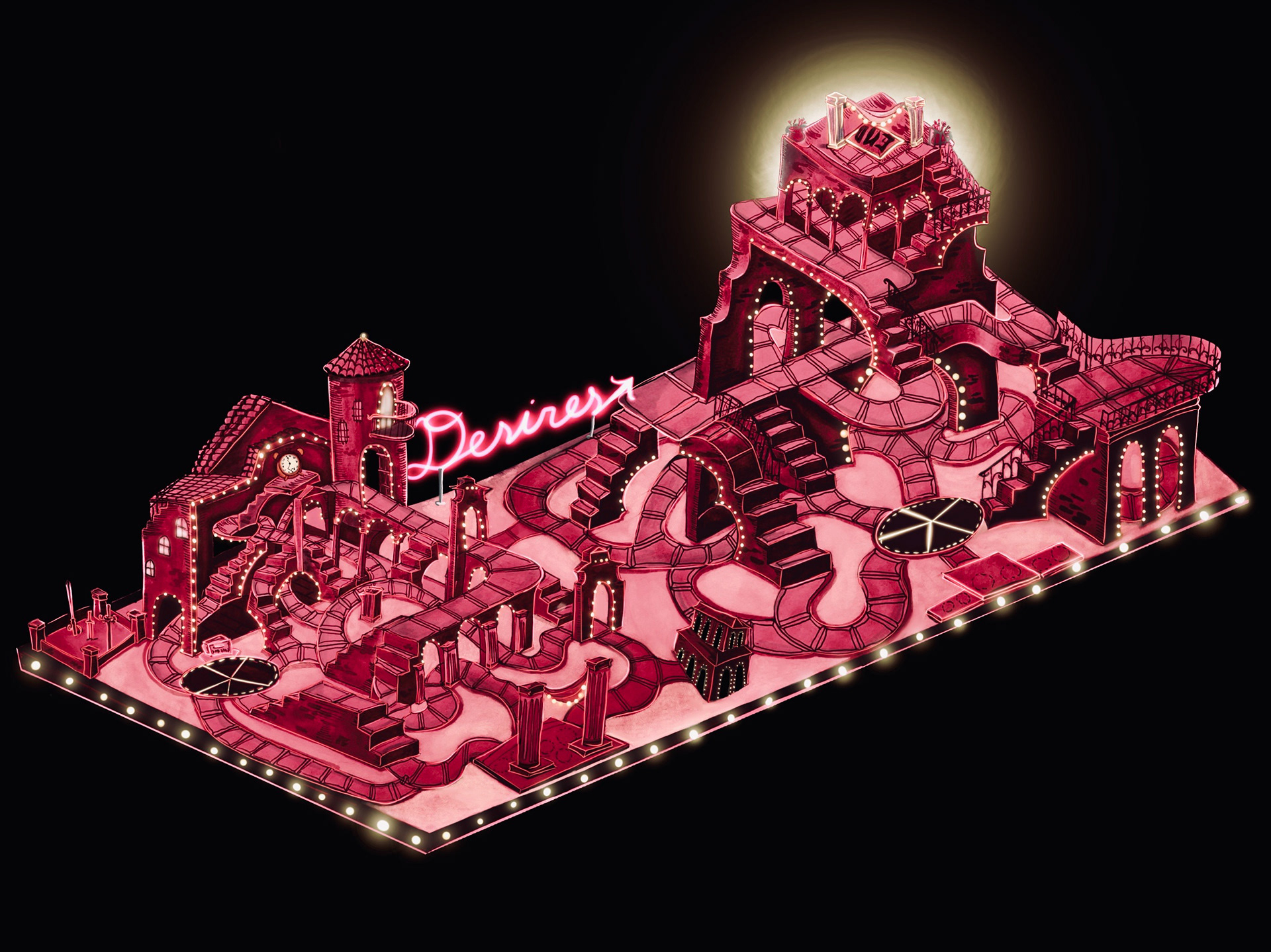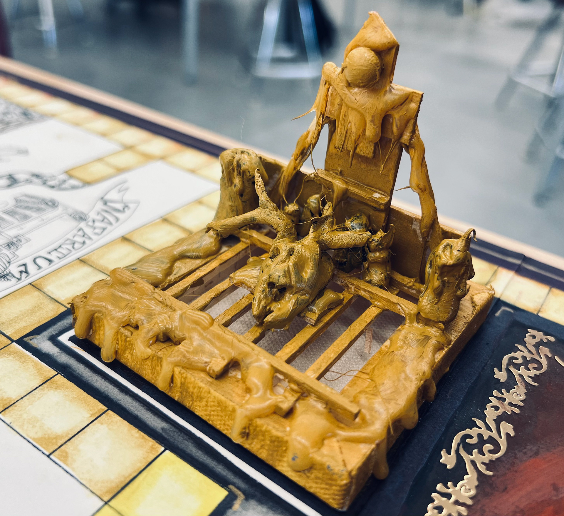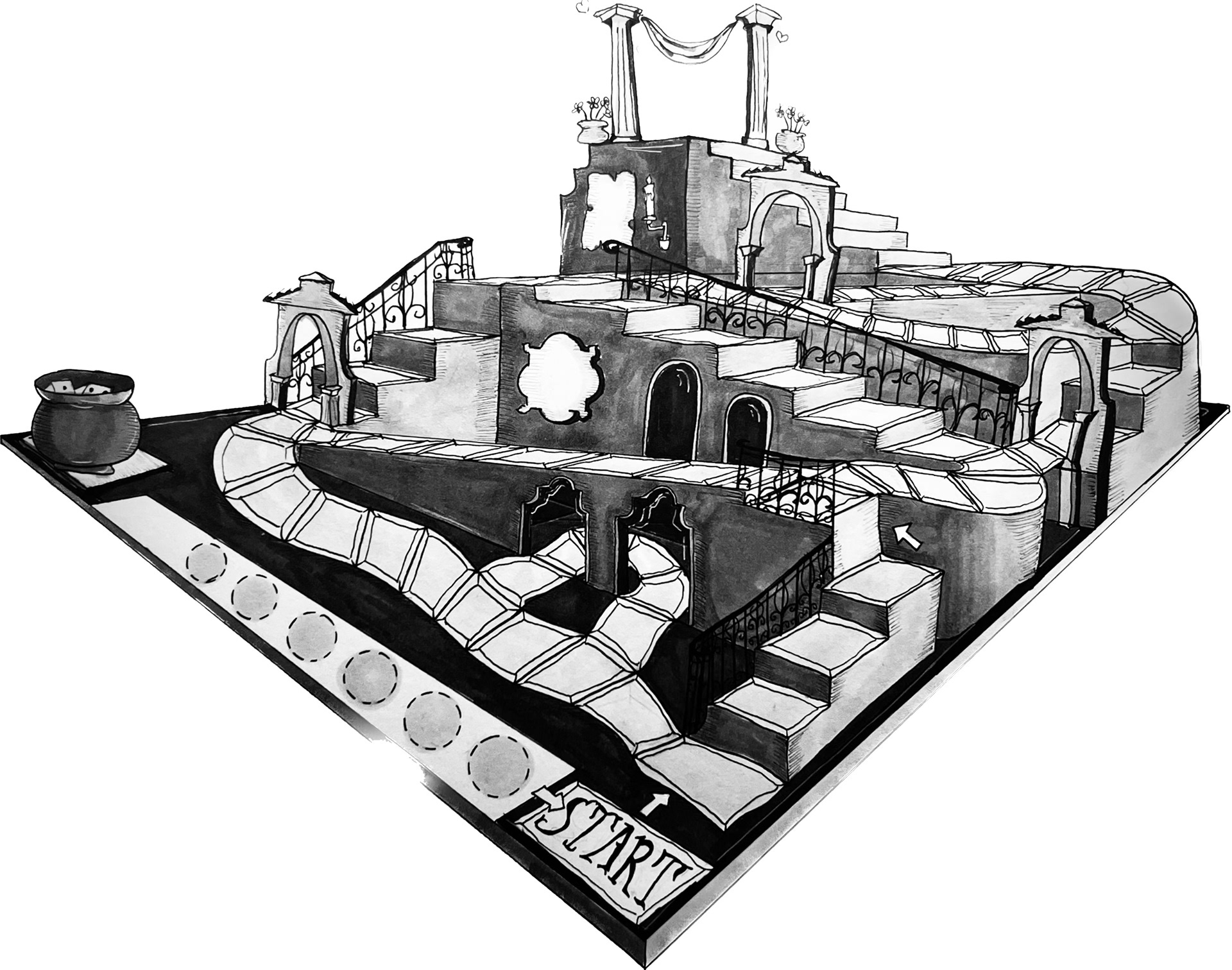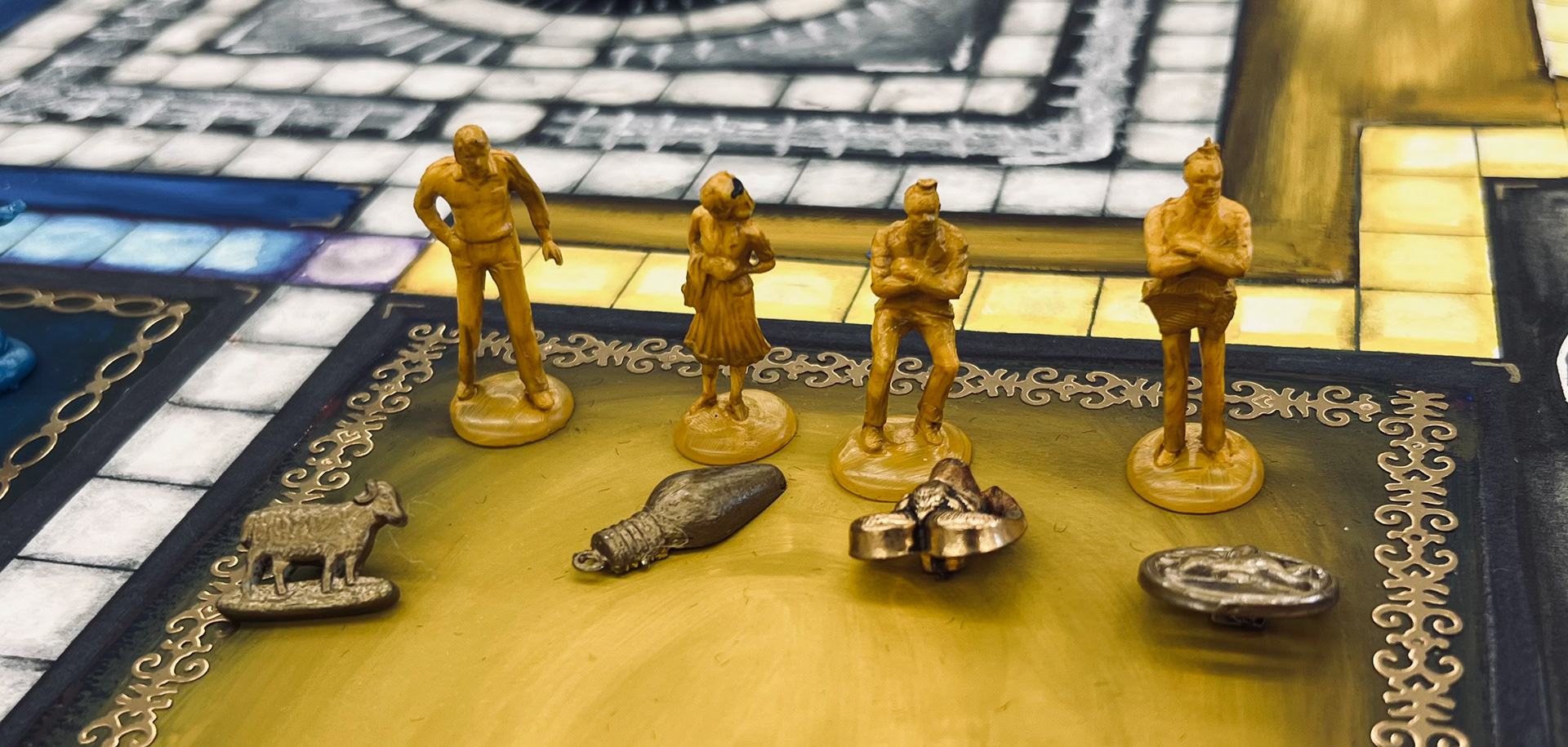 Below is a series of iterations of a board game design based on the play "House of Desires" for a 'Design for The Stage' class.