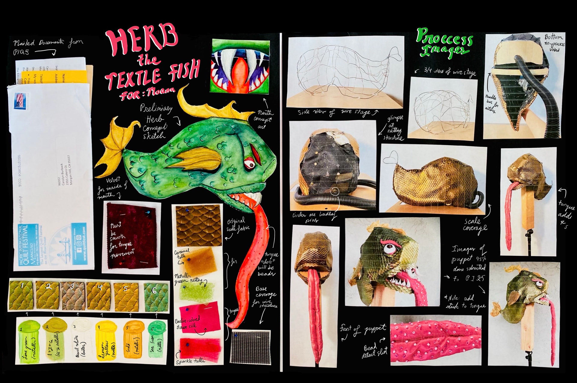 Fish puppet with handle inside the body and movable tongue via stick for a production of "Moana Jr." Won 2 awards within the Pacific International Quilt Festival 2021.
