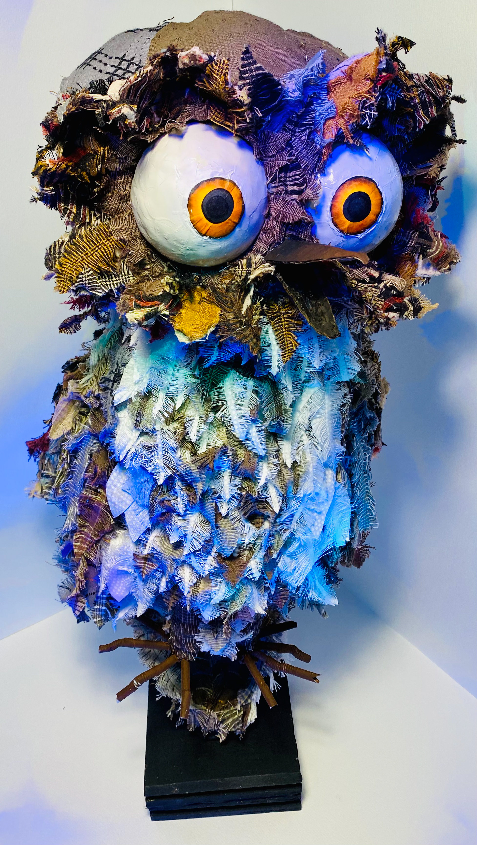An owl puppet with a rotating head, moving beak, and flapping wings made of recyclables and scrap fabric I gathered while in Montana where I saw an owl as inspiration.