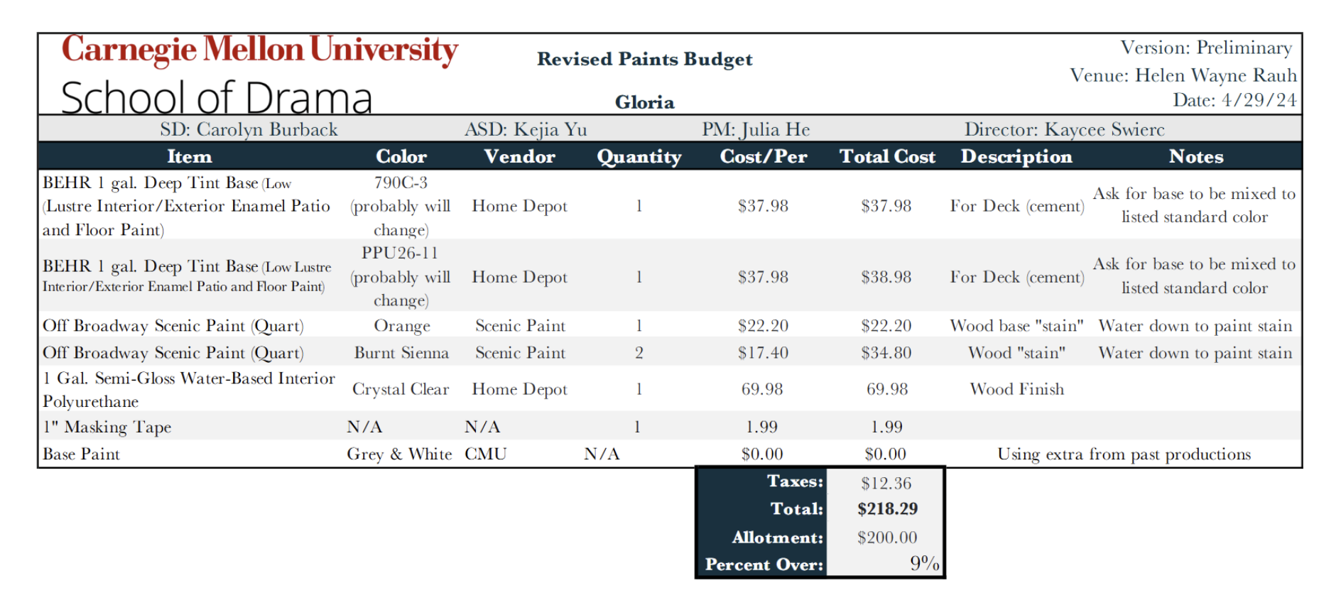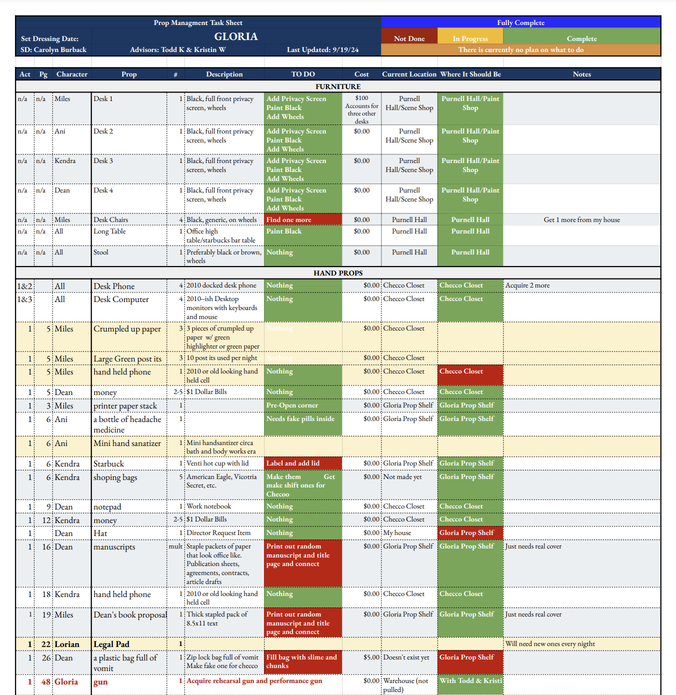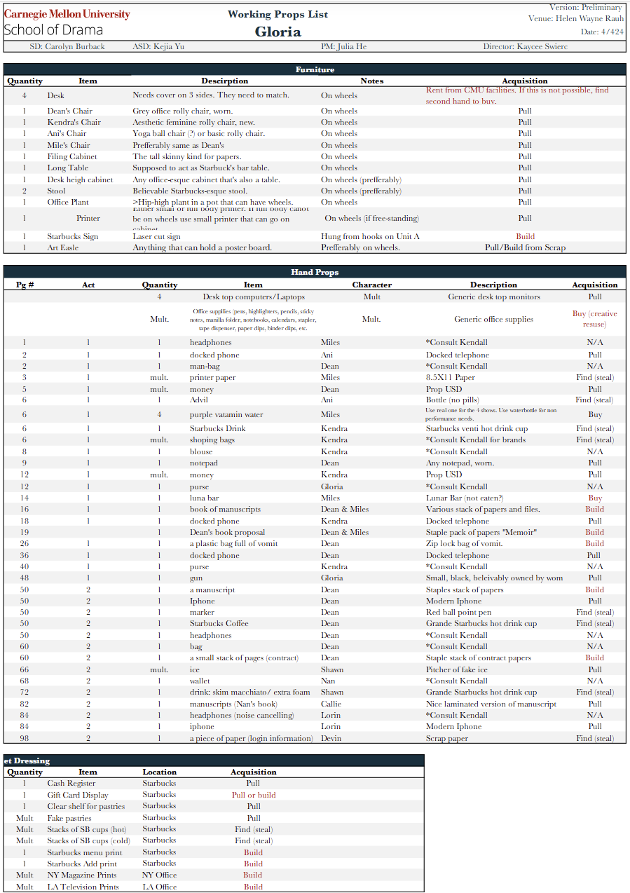 Gloria Props and Paints Paperwork Samples