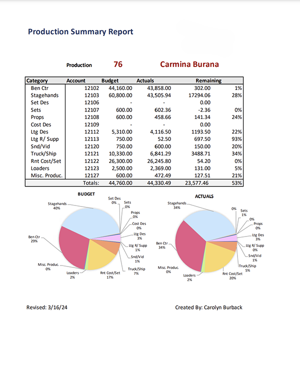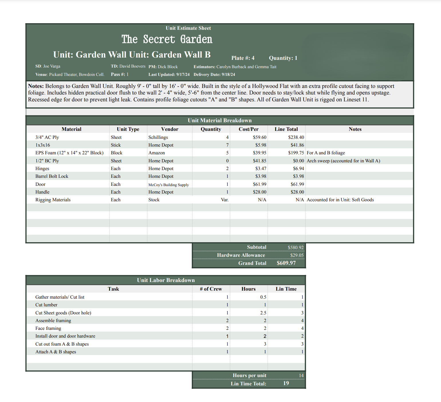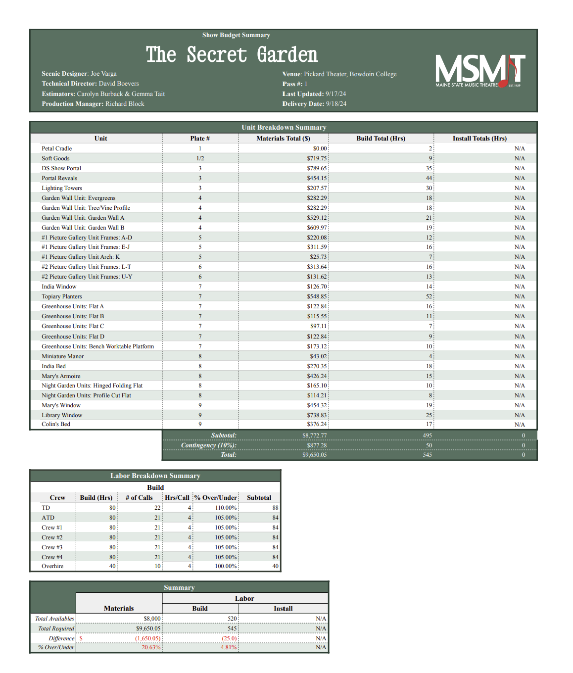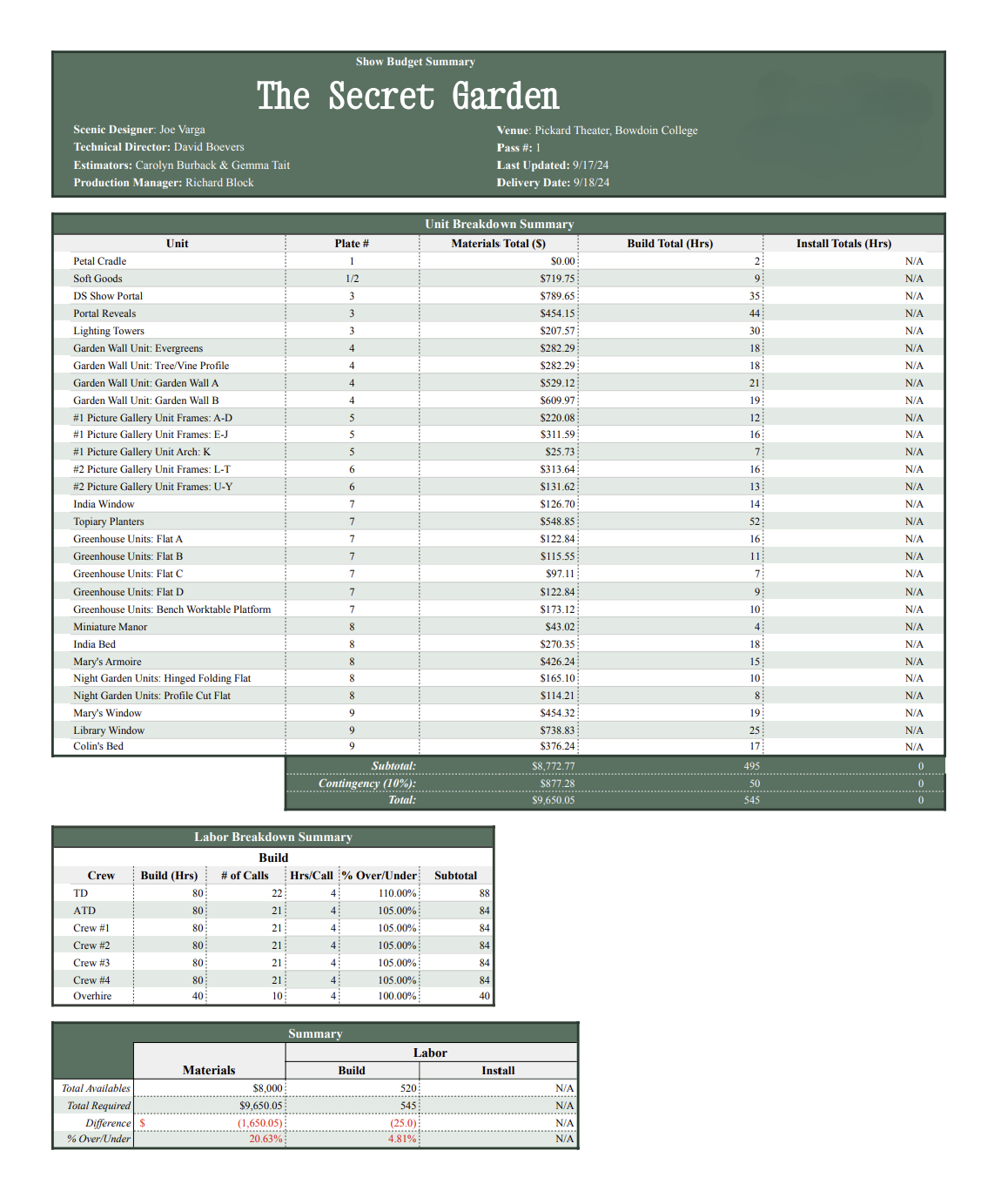 Budget Summary and Unit Breakdown Sample. Created in collaboration with Gemma Tait. (Was an assignment to budget a scenic packet.) NOT A REAL PRODUCTION