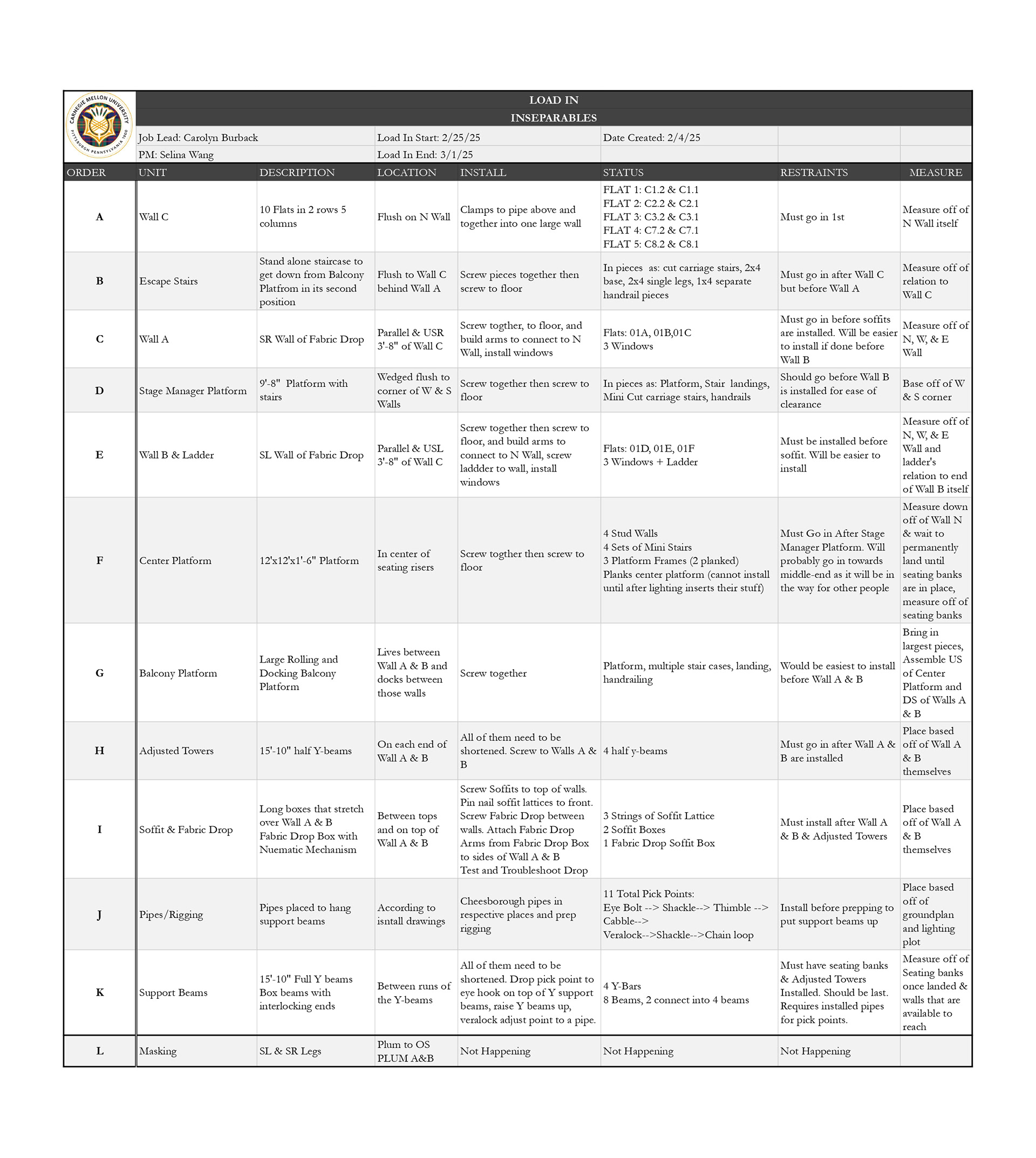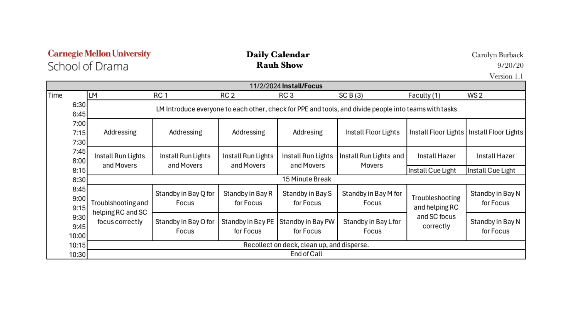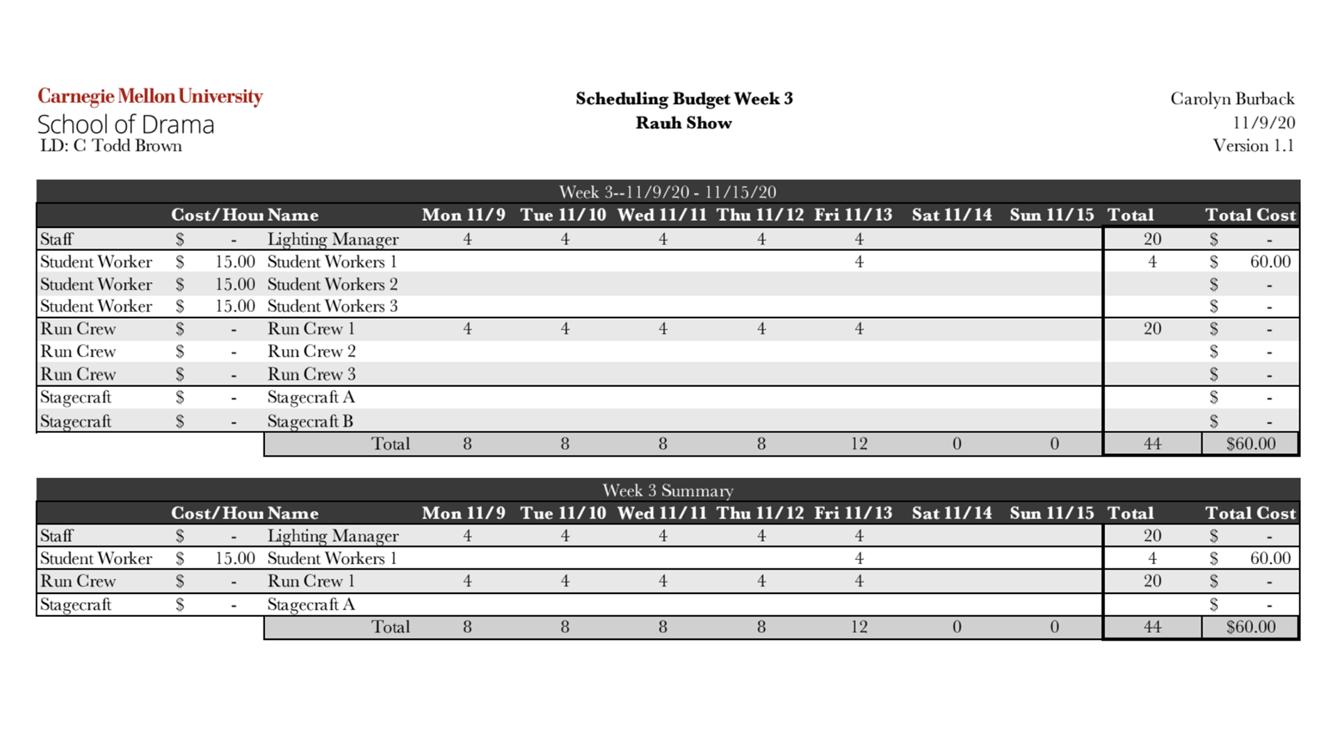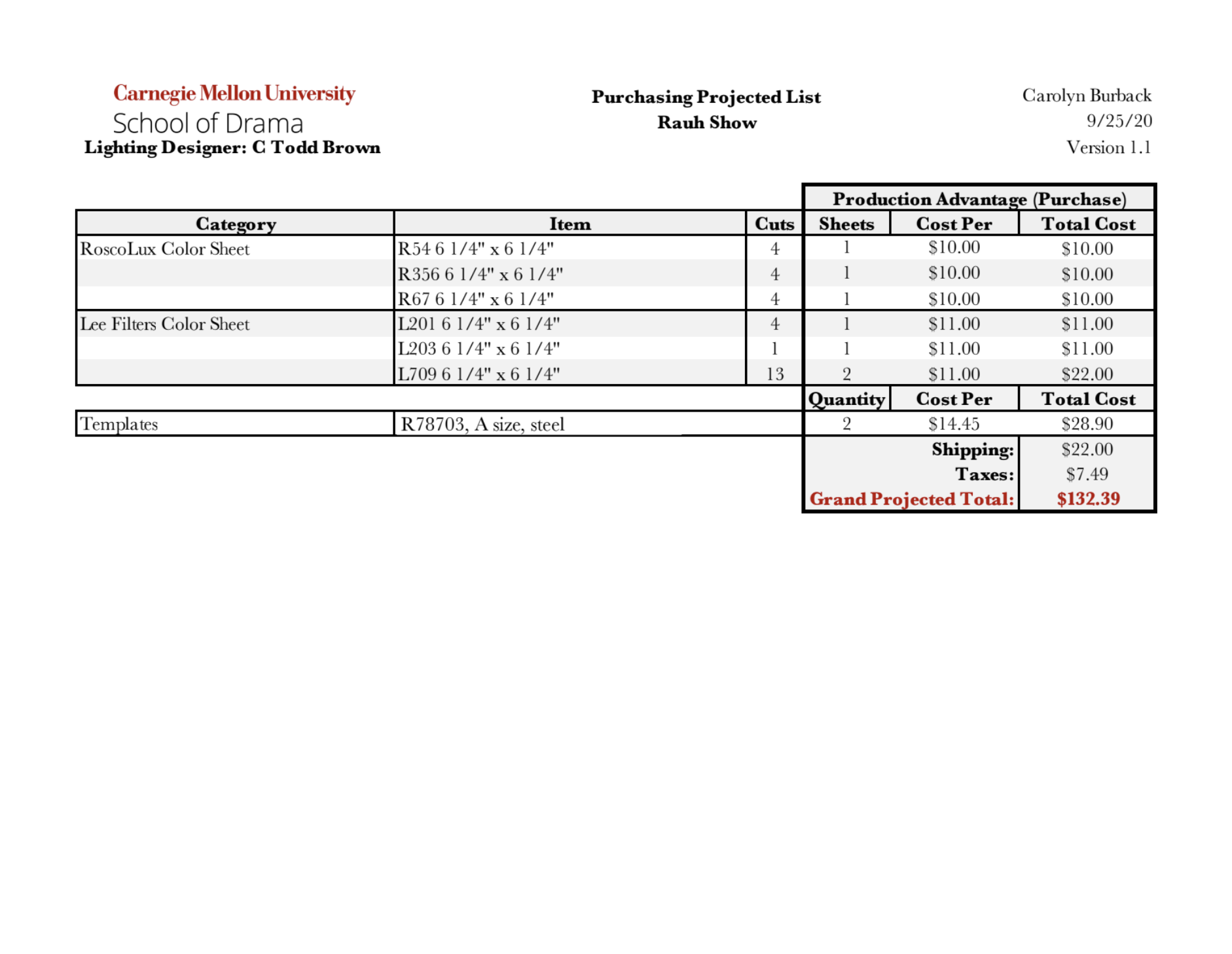 Lighting Management paperwork examples from a larger packet. (Assignment was for a hypothetical show.)