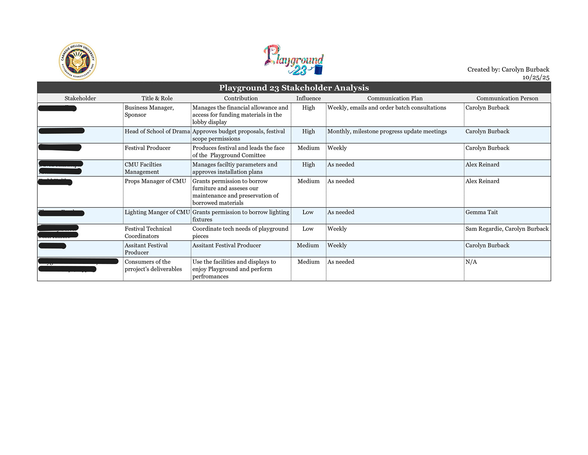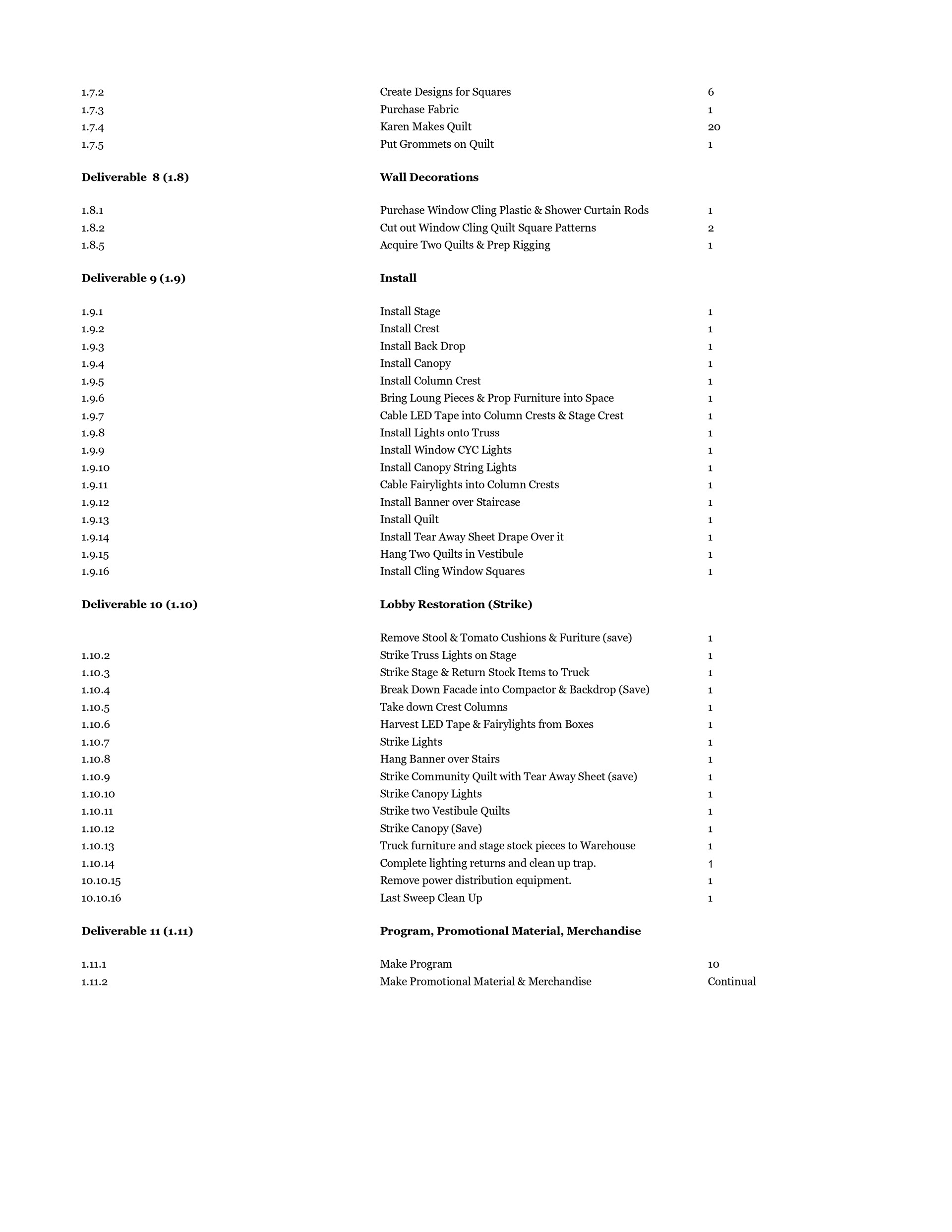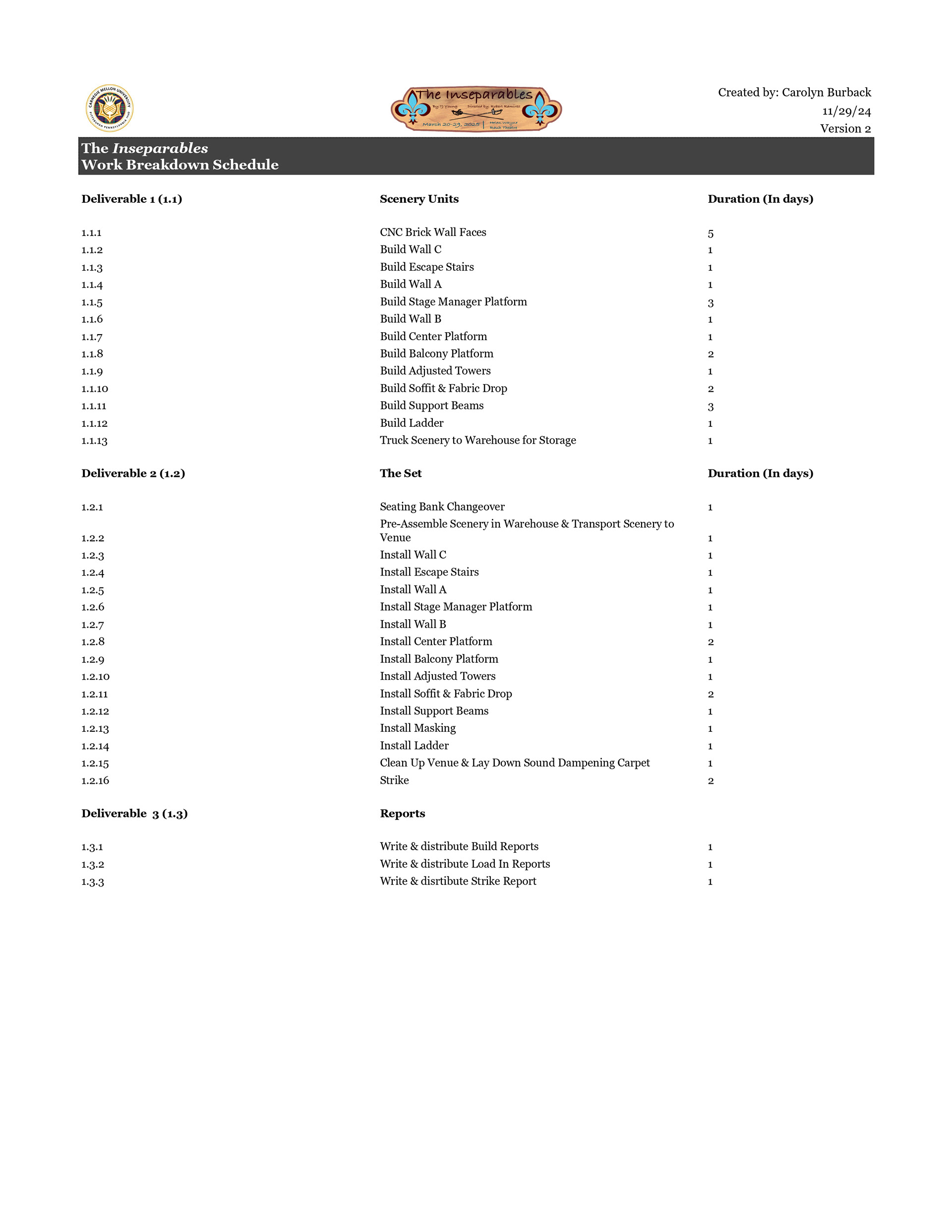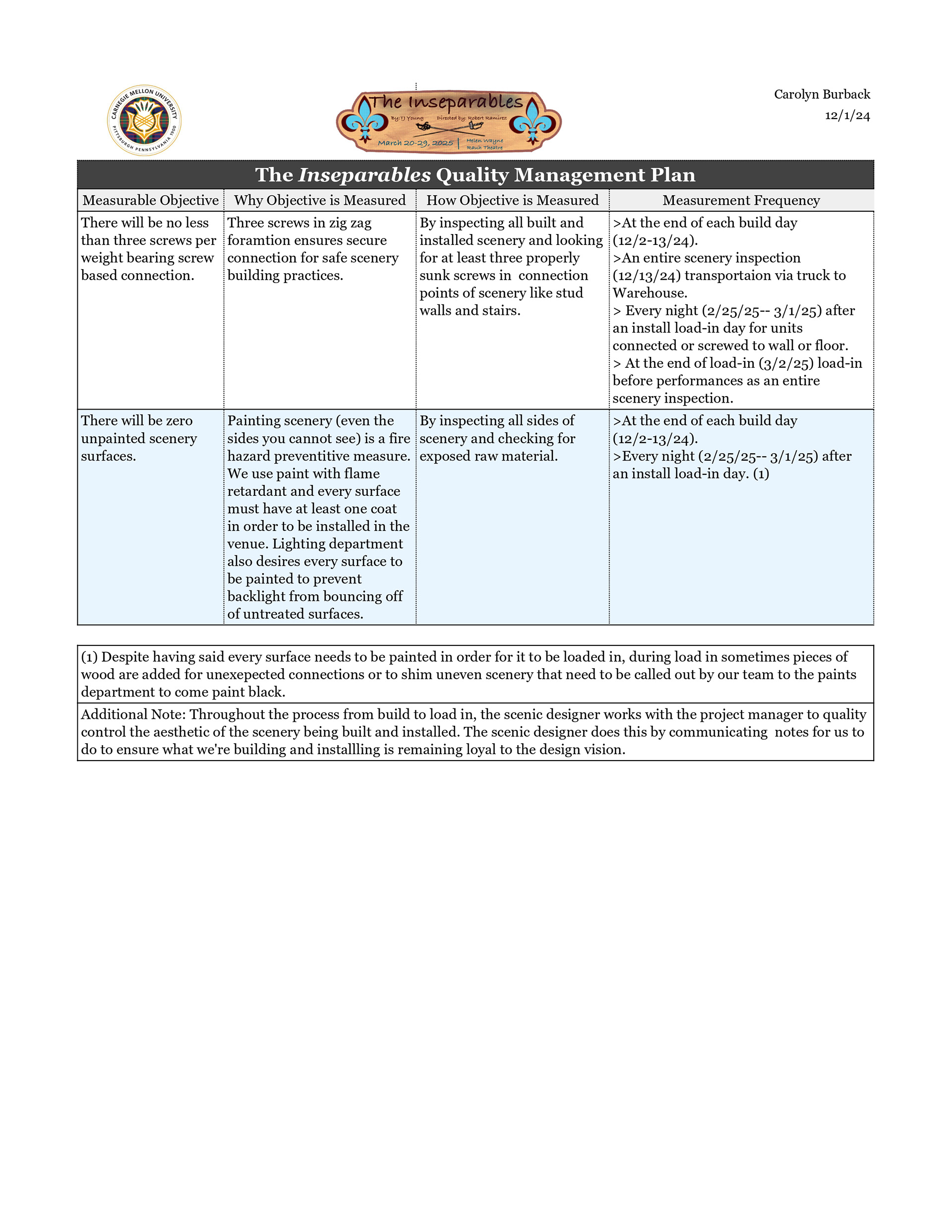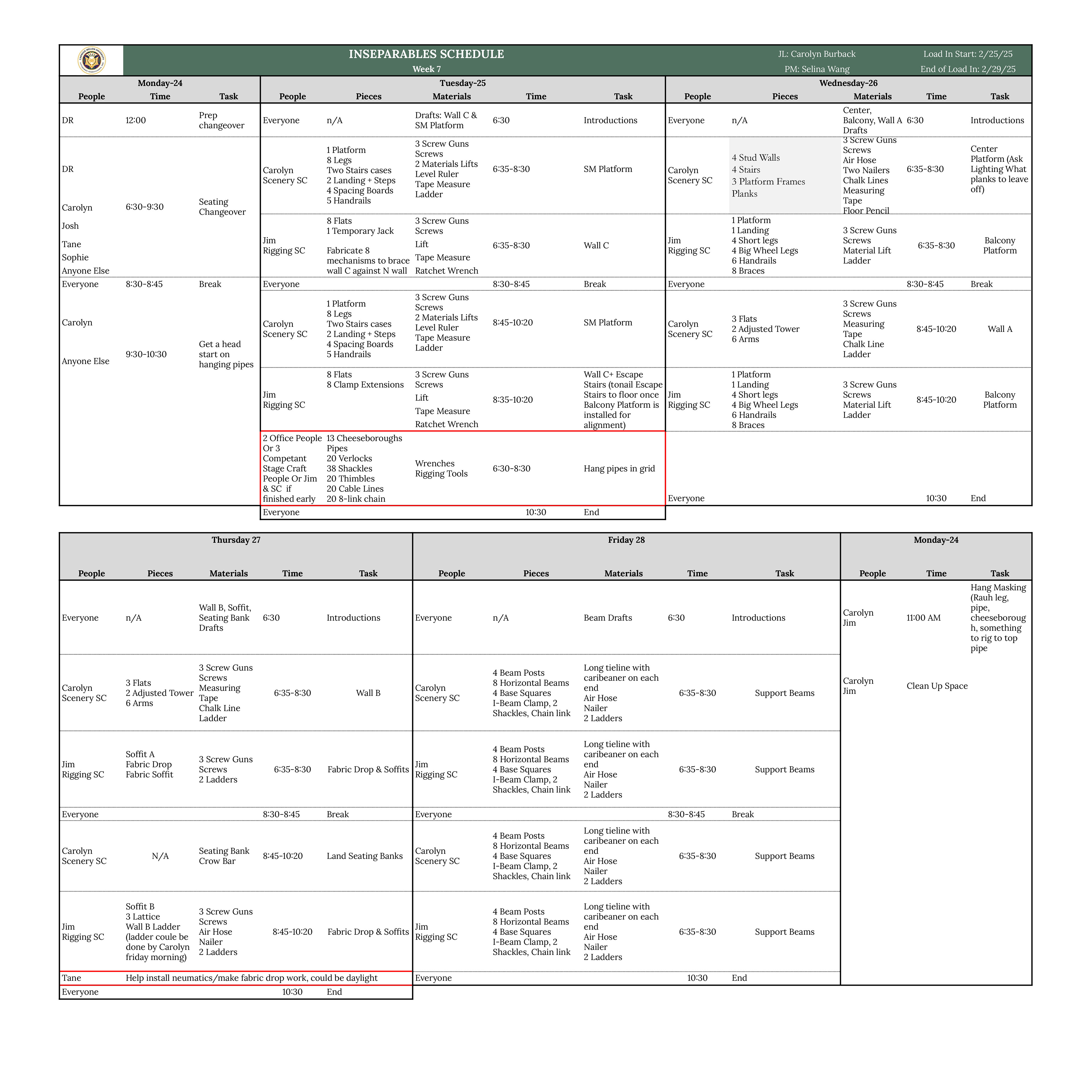 Lighting Management paperwork examples from a larger packet. (Assignment was for a hypothetical show.)