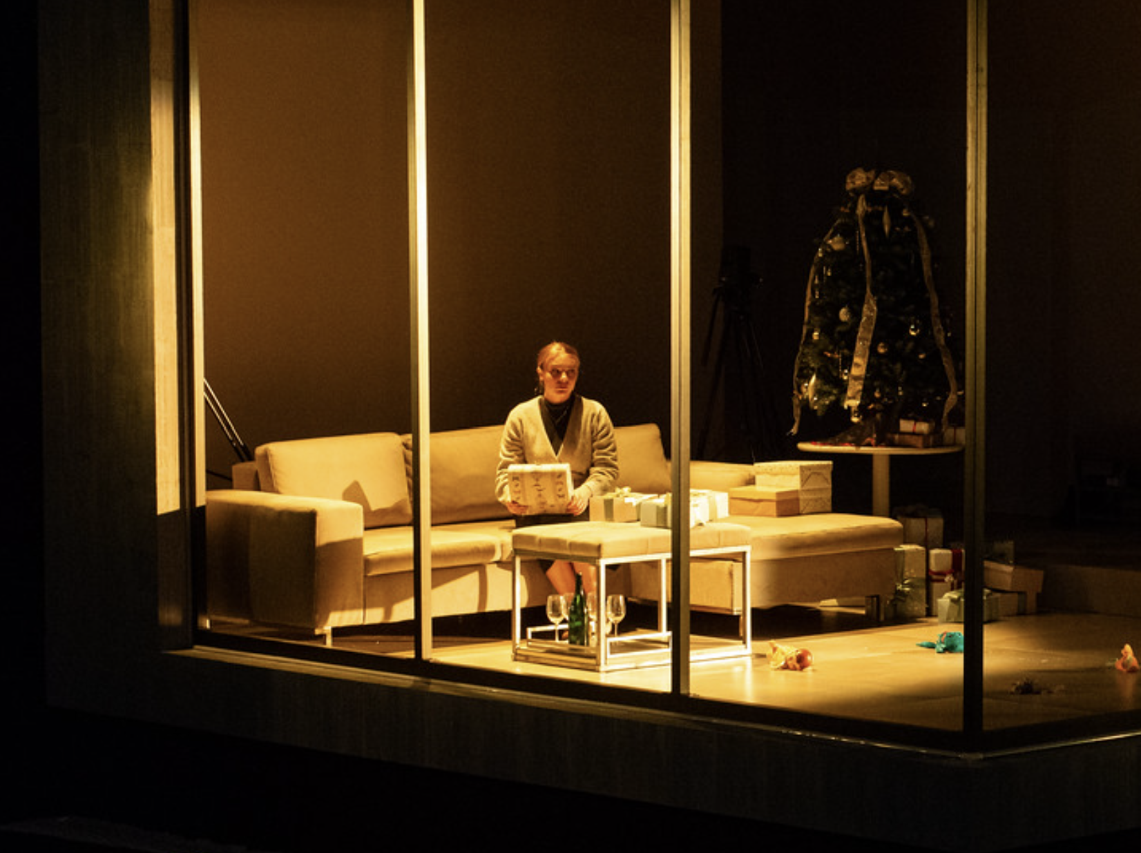 Constructed rolling bed with locking wheels and double sided headboard to become a theatre booth on the other side. Photo by Dave Rubin.
