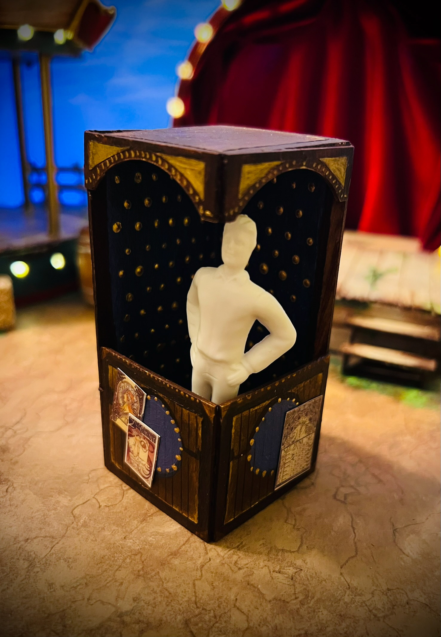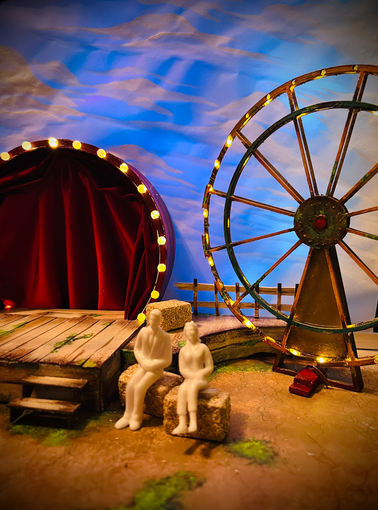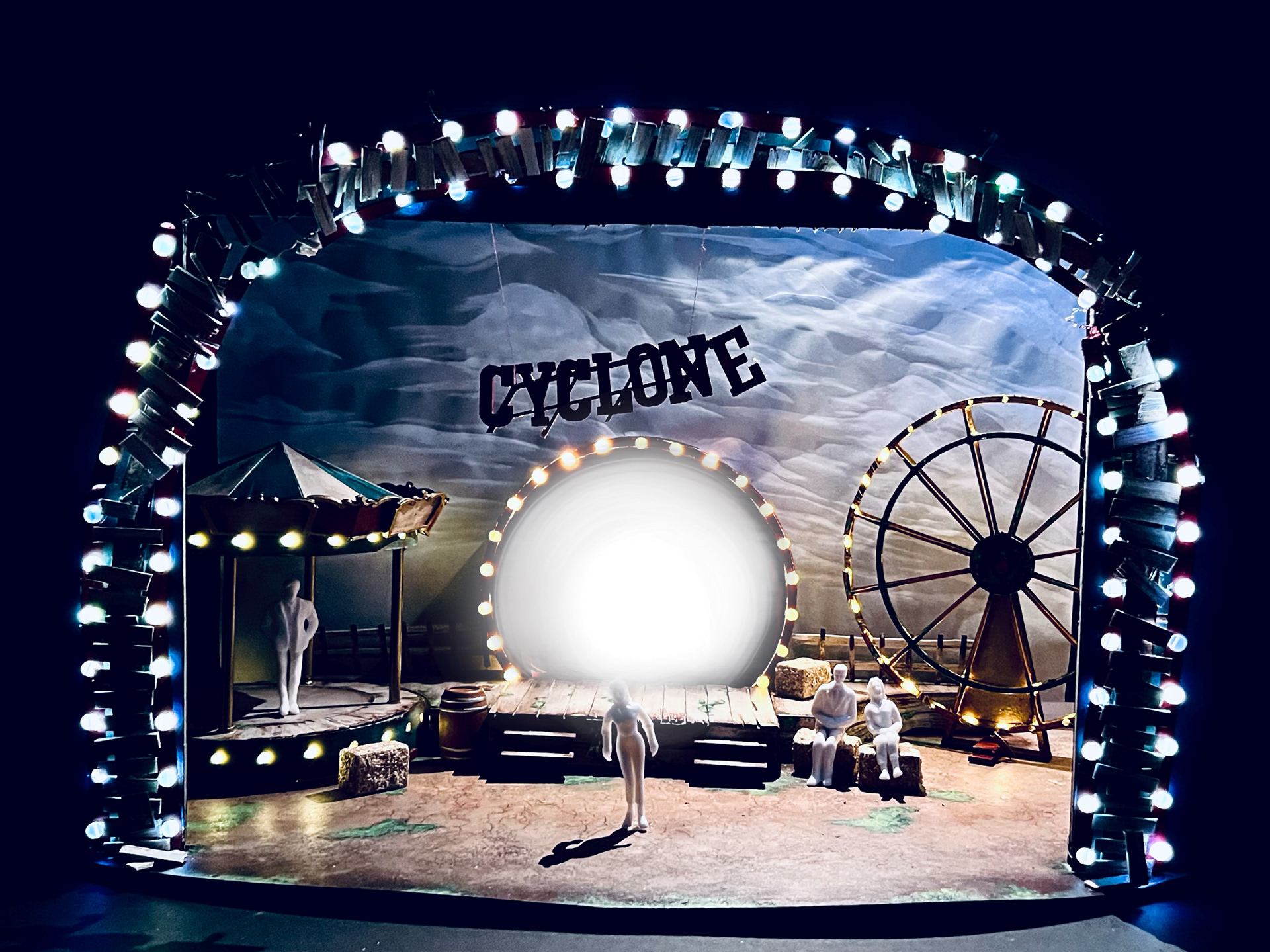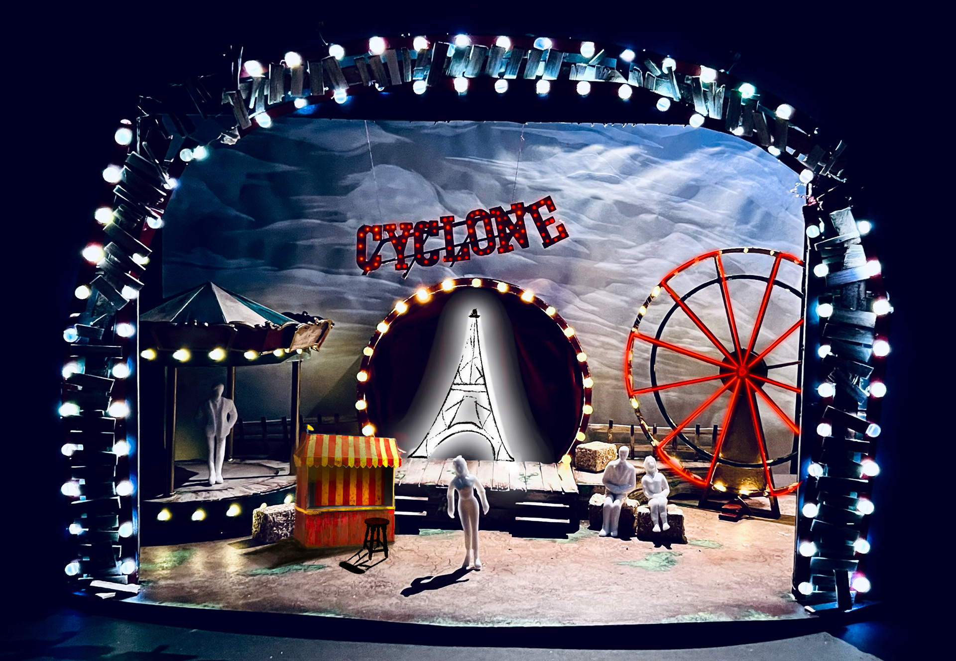 Design Statement: The design for Ride The Cyclone embodies the cyclical nature of life and the way the world moves on when we pass. With the show's messages of life just being a ride that can end at any moment, we see a beautiful depiction of what the carnival once while simultaneously decaying in a controlled way that mimics fading stories of the teenagers. The surfaces are all of painted, faded wood and colorfully rusting metals. The lights in former ride pieces booths electrify back to life to bring ambient light back to the carnival remnants to help add both a mystical element as well as visual interest to the individual stories that all demand different energies. The inclusion of a linear strip of theatrical bulbs framing the stage will tie in the game show/theatrical nature of Karnak’s game. We are rejecting the original direction for this to take place in a warehouse and instead are going for a ghost void of what once was a happy country fair.